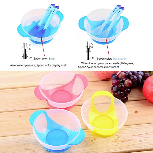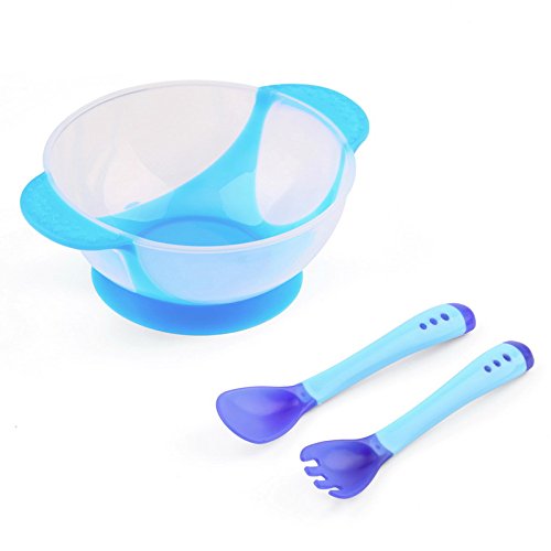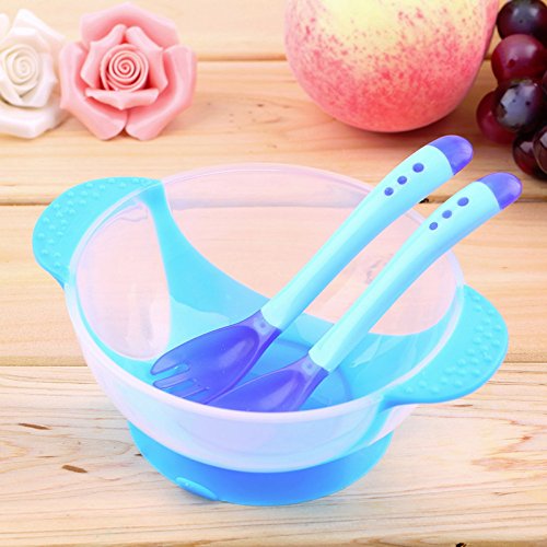 ベビー食器セット 吸盤付きのボウル 温度センサー付きのカトラリー 割れないボウル ひっくり返されにくい やけど防止 華やかな色 (ブルー)