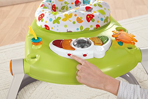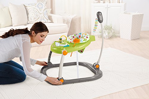 Lets baby jump safely-no doorway required;Lights, sounds and music reward baby for jumping;Soft-sided overhead toy bar with squirrel roller ball and two woodland friends spinners;Light-up musical piano;Froggy teether, clacker ring bar, caterpillar clicker