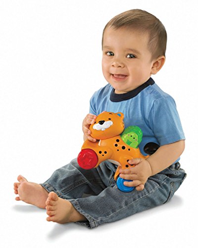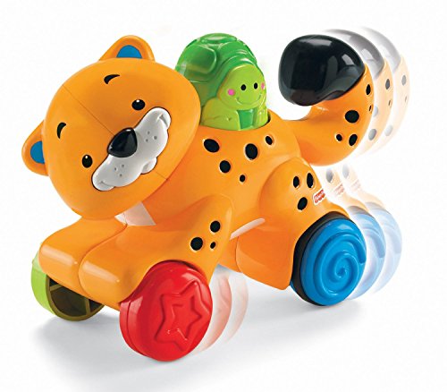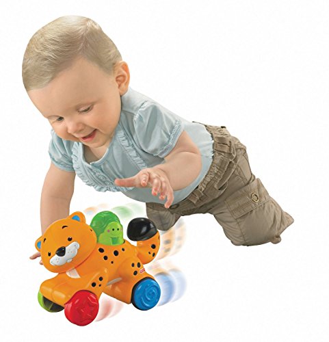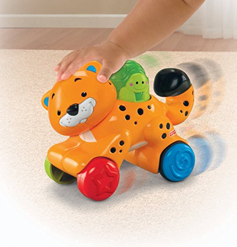 Whee! Baby will have a blast crawling after this cheerful cheetah as he rolls along. Press down on the turtle to get him going, and watch his tail swing as he moves! Turn his head for fun clicking sounds. No batteries needed.