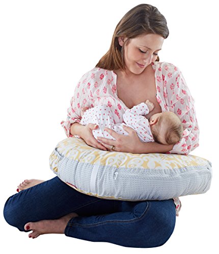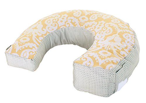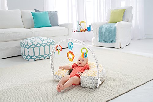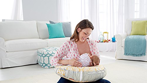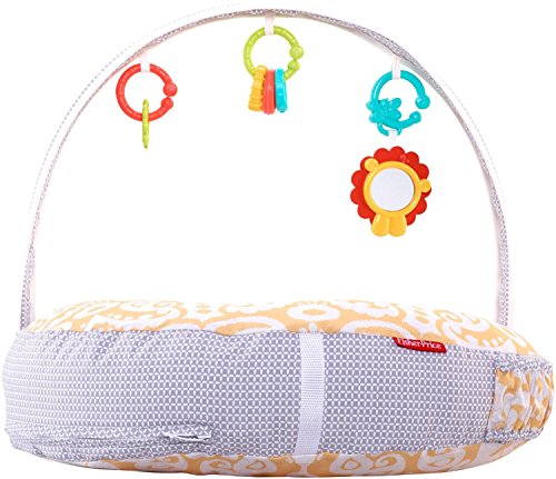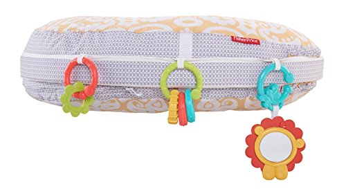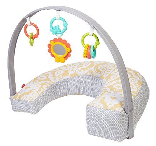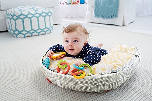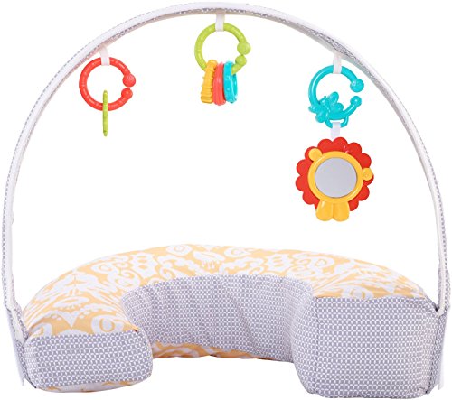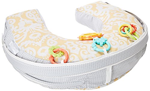 4-in-1 pillow for feeding and play, U-shaped high/low pillow for breast or bottle feeding, lay and play lounger, tummy time play wedge, sit and play support;Soft, u-shaped fabric pillow is comfortable for moms and babies of all sizes;Three linkable toys: a shiny mirror, clacker rings and a teether;Machine-washable cover with handy storage pocket on the side;Handle for easy, one-hand carry