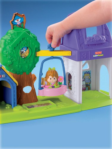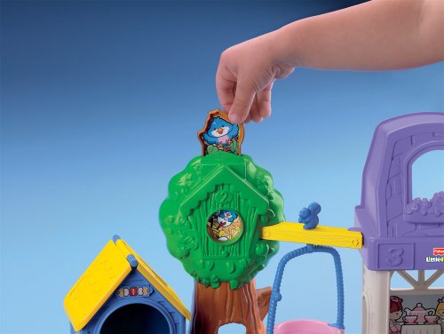 There’s so much to do in this backyard, you could play all day Every time you press on the birdie, you hear chirping sounds and see a different picture in the birdhouse Play in the sandbox or play peek-a-boo behind the tree Go for a ride in the spinning swing, play on the slide or ride the trike. What a perfect play day—and a perfect addition to the Happy Sounds Home™ (sold separately and subject to availability). Includes playhouse with swing, tree, doghouse, girl, dog, slide and trike.