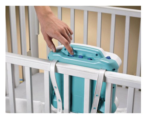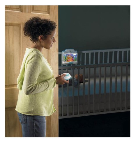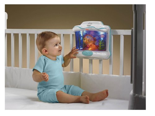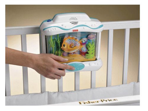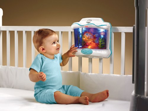 The Soothing Seas Aquarium is a crib attaching infant soother that captivates baby with the mesmerizing effects of water. The wrap around design offers baby a better water view than ever before. Mama Fish has a realistic motion as she appears to be swimming through the water, followed closely behind by her baby. Their little crab friend plays peek-a-boo behind the coral as the seaweed sways gently in the waves. There is a light underneath the action and soothing blue lights fade on and off overhead. Lovely classical music plays one of 5 songs (or one of 3 sound effects) all the while bubbles rise upwards to the surface. Up to 18 minutes of continuous musical play. 4 classical styled songs, 2 sound effects. 3 modes of use:1 = Sounds, Lights and Water/Swimming Motion. 2 = Sounds & Lights. 3 = Sounds only. There is a remote control which activates the soother from the doorway. Fits most standard cribs.
