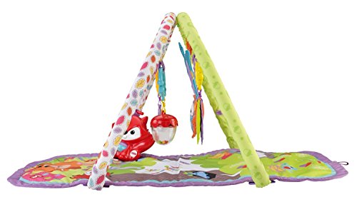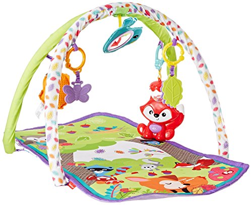 Portable activity gym keeps baby busy with toys, sounds, and music. Five linkable toys plus an adorable take-along musical fox with fun sounds and two music modes keep baby busy on a comfy, padded, portable activity play mat with two soft play gym arches overhead. Music plays for up to 10 minutes in long play music mode, and you can rearrange the linkable activity toys to change the experience for baby, every time she plays.