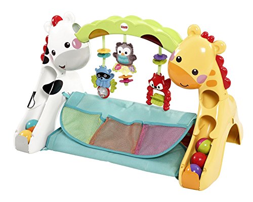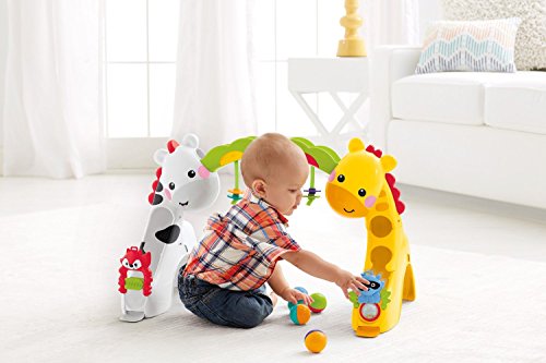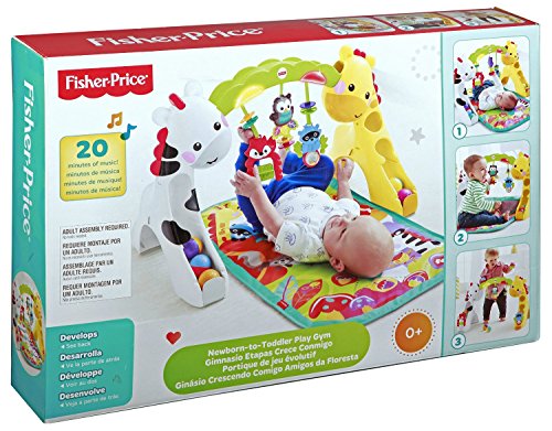Three grow-with-me stages and more than 10 activities and toys. Convertible activity play gym with lights, sounds and music, over 12 activities and toys to discover, adorable animal toys, and three grow-with me stages of play entertains baby from newborn to toddler.
