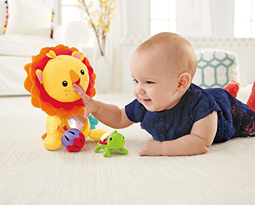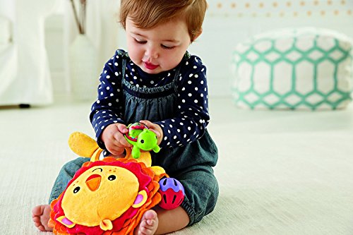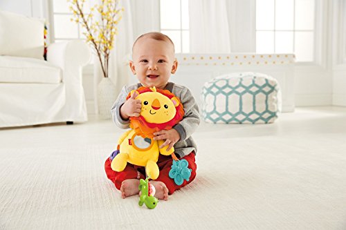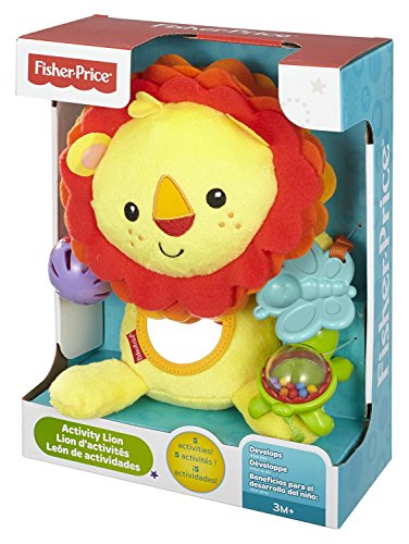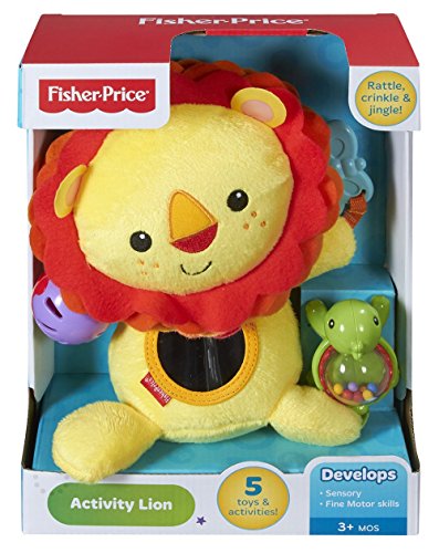 The Fisher-Price Activity Lion has his paws full with fun activities for baby. A mirror promotes self-discovery, interesting textures help stimulate baby's tactile senses, a rattle and jingle ball help enhance auditory development, and a teether helps soothe baby's gums. This plush lion is easy to clutch, easy to shake and easy to love with his sweet face and soft, cuddly fabric. A great pal for home or on the go.