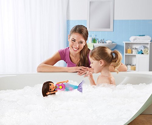 Get ready for a magical mermaid adventure with Dora! Wind Dora's tail and press her seashell necklace to see her move through the water like a real mermaid! As she swims, Dora's tail will sparkle and shine with colorful lights! Mermaid Dora also features soft hair you can style!