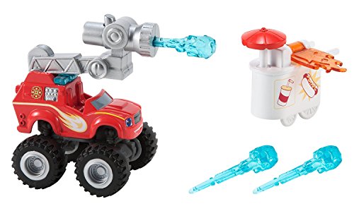 Blaze is ready to join all of his big-wheeled buddies on a new high-octane adventure! This time there's a fire and somebody's in danger, so Blaze has transformed himself into a water-blasting rescue vehicle, just like he does on his show. Aim and fire blaze's spring loaded water cannon to shoot water projectiles at the flaming flip down targets. This small scale fire truck Blaze with pivoting water cannon and spring loaded launcher includes everything you need to recreate an exciting new adventure of Blaze and the Monster Machines.