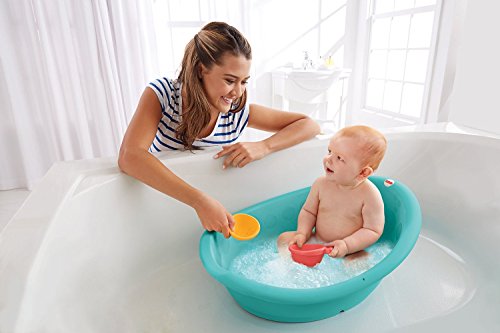Three-stage bath tub grows with baby from newborn to toddler. A grow-with-me baby bath sling and 3 stages of use make the Fisher-Price rinse 'n grow tub the only tub you'll need for baby-all the way from newborn to toddler. in stage 1, the soft, machine-washable newborn tub sling comfortably cradles little ones at a gentle recline, in just the right amount of water. As baby grows and is ready for stage 2, the sling easily adjusts to provide the right amount of support for older babies to sit more upright, while still helping to prevent slipping and sliding in the tub. Two goldfish strainer cups are handy bath time tools for washing and rinsing (it's easy to reach around the sling to scoop water), and as baby grows, the cups make fun bath toys for water play, too. Remove the sling for stage 3 toddler tub time, so there's plenty of room for toddlers to sit up and play. Now the sling converts to a hanging mesh-pocket storage bag to dry and store tub toys. The rinse 'n grow tub is just the right size and shape for baby at every stage, with a built-in pouring spout and a drain plug for quick and easy drain and dry. No need to fill and clean the full-size bathroom bath tub after every little bath.