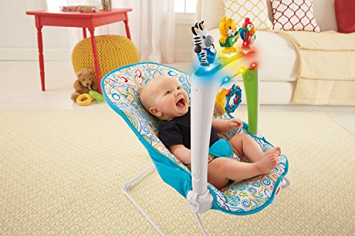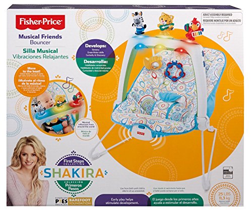 Introduce baby to an early love of music and global beats with this fun-filled bouncer, developed in partnership with musical superstar Shakira! Musical Friends Bouncer helps entertain baby with a removable toy bar featuring lights, sounds and music, and animal activity toy friends. Baby can pull down on the activity toys to activate up to 20 minutes of sensory-stimulating music, sounds and a colorful 'dancing light' show that encourages eye-tracking. Animal friends bounce and wiggle overhead as baby's own movements make the seat gently bounce, encouraging baby to reach and grasp. For soothing, switch on calming vibrations, remove the toy bar, and let baby nap or relax on the soft, machine-washable, dryer-safe fabric seat pad with adjustable three-point restraint. When it comes to baby's development, the early years are the most important. Each play experience is an opportunity for baby to explore the world around them, taking it all in, learning, doing, and discovering new things along the way. The Shakira First Steps Collection encourages baby's well-rounded development, helping baby get ready for their first steps and beyond!