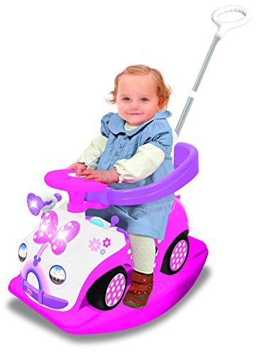 Hear Minnie play her favorite song with flashing light-up bow!;Press colorful piano keys to play and hear lovely music. Press key and shift gears for revving engine sound;Honk horn or press little horn on helping hand for lively tunes;Removable rocking base for rocking or riding fun!;Transforms from rocker to push-along to ride-on! With rigid support around seat for extra comfort & safety