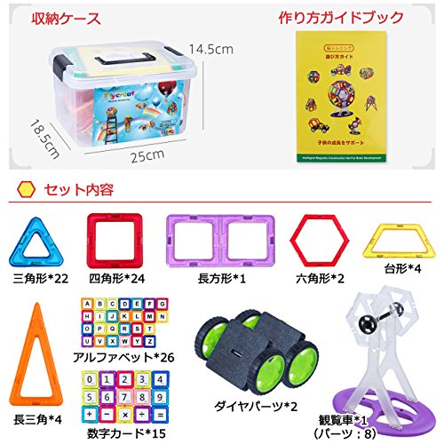 - 【セット内容】:102pcsのセットには、24pcsの正方形、12pcsの三角形、4pcsのマグ3(正三角形)、2pcsのマグ6(六角形)、4pcsの台形、15pcsの数字カード(非磁性)、26pcsの英字カード、1pcsの観覧車、2pcsの車輪。ご注意:アイテム画像に関しては出来る限り忠実に表示出来るよう努めておりますが、お客様がご利用の画面の設定及び特性により、実際のアイテムと比較し色味に若干の誤差が生じる場合がございます。