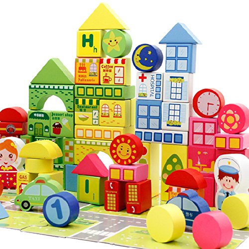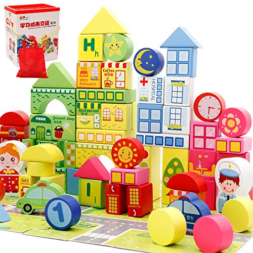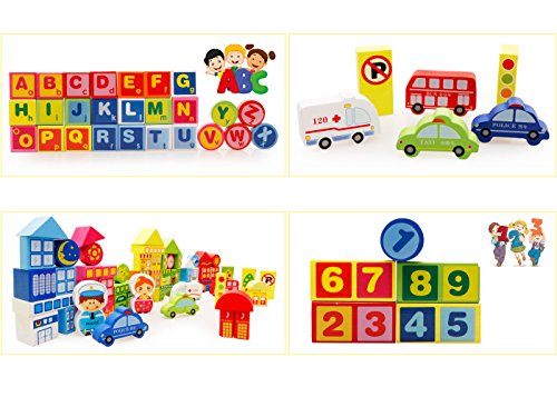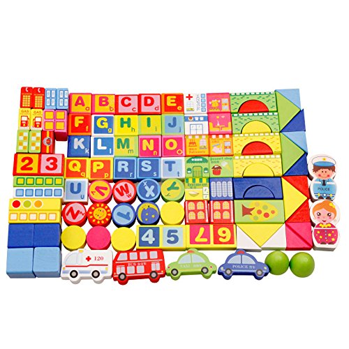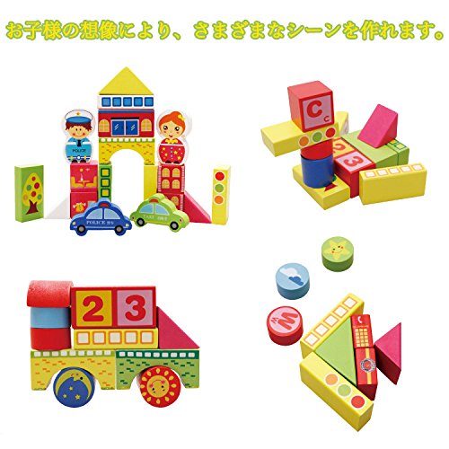 FlyCreat ブロック 積み木 おもちゃ 玩具 木製 数字/英語/形状/色彩認知 早期開発 指先鍛え 認知力 実践力 ままごと ごっこ遊び 知育 男の子 女の子 収納ケース付き 100ピース