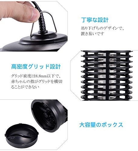 - 【操作簡単】:蚊取り器本体の上部にリングがついて、吊り下げ用チェーンも付いているので、吊るして使用できます。 そして、虫の死がいは、殺虫灯本体の底の受け皿にたまり、簡単に捨てられます