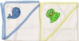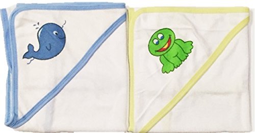 Soft cotton hooded bath towels;Baby blue and light green rimmed hooded bath towels for babies 0+ months;2 pack, machine washable;Adorable stitched whale and frog emblems;Product dimensions 20 x 24