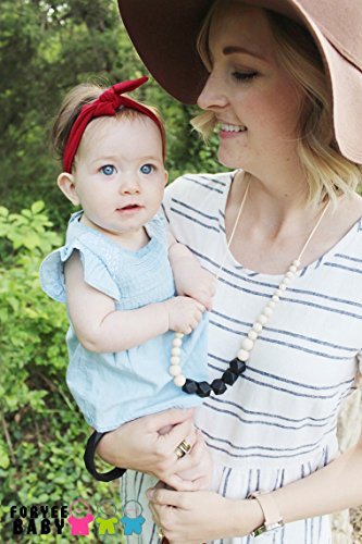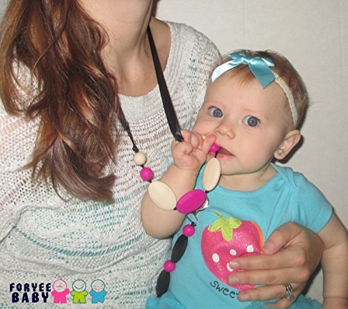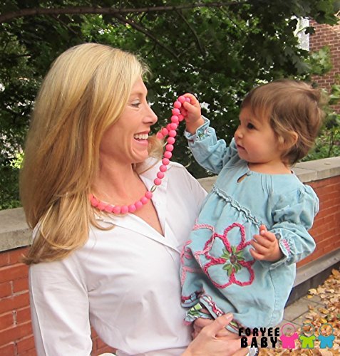 Foryee Silicone Necklace are made out of 100% silicone beads that are soft on your baby's gums and emerging teeth. The beads are great as a sensory tool to help babies focus while nursing and as a colorful toy while babywearing that won't get lost.