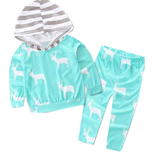franter新生児赤ちゃん男の子女の子クリスマス鹿プリントパーカートップス+パンツ服装セット グリーン