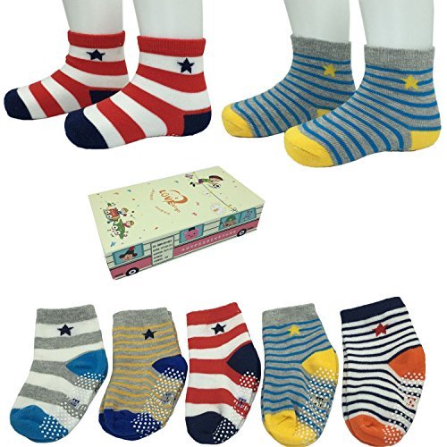 LEADSY 5 Pairs Non-Skid Shoe Socks Baby Boy Girl Toddler Anti Slip Cozy Stretch Knit Stripes Grips Cotton Ankle Footsocks Sneakers Crew Walker Socks [並行輸入品]