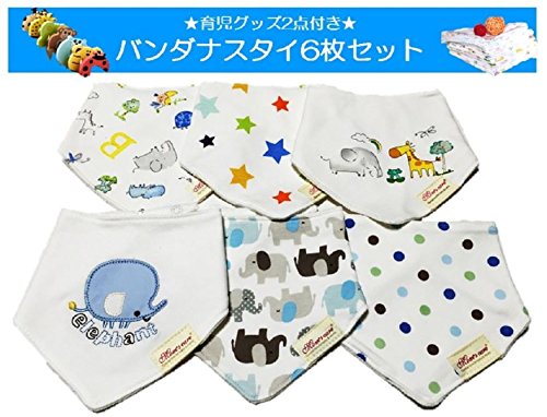 (Fun Market) 三角 バンダナ 型 コットン スタイ よだれかけ エプロン セット (バンダナ型, B7.ぞう&きりん6枚+グッズ付きelgfl6)