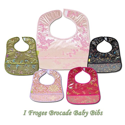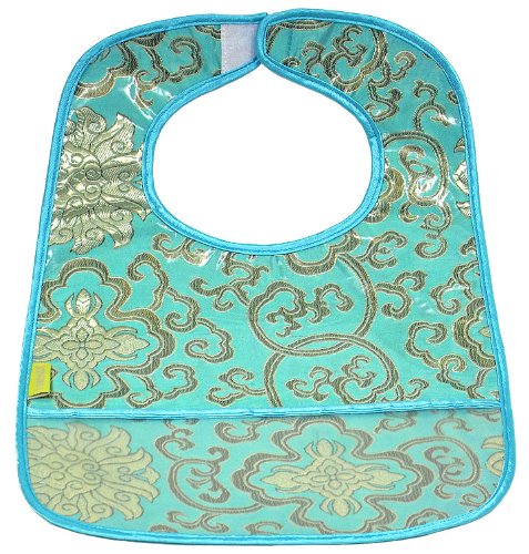 2 of Asian Brocade Fabric Baby Bibs;Easy on/off (velcro closure);Light weight, waterproof(instantly reusable - just wipe clean);Back lined with white soft cotton;Machine washable