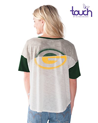 中にお気に入りのチームの応援時にスタイリッシュな側面を見失ってしないフットボールシーズン!この60 %コットン/ 40 %モーダルVネックTシャツは高品質のグリーンベイ・パッカーズのロゴを特大デザインが施されています。標準の女性のサイズ。