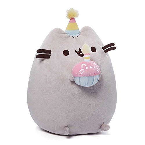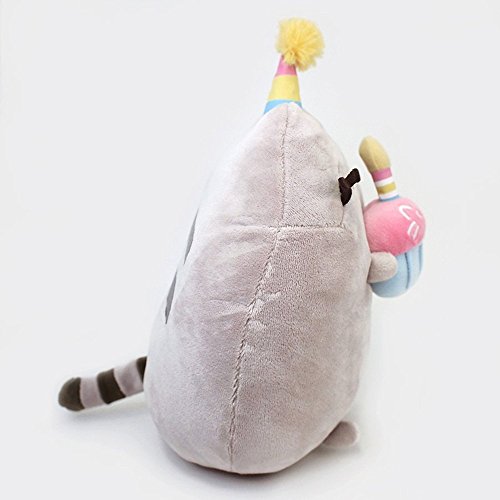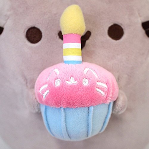 - Pusheen birthday plush toy features party hat and embroidered kitty cupcake