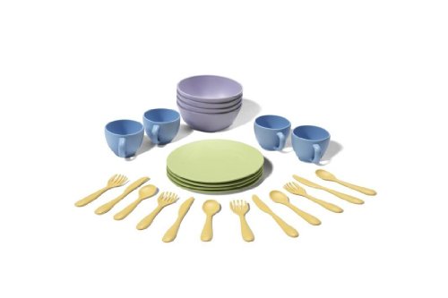 - 24 pieces: 4 Plates, 4 Cups, 4 Bowls, 4 Place Settings (Fork/Knife/Spoon)