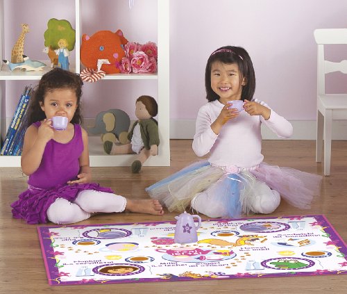 Includes food safe tea set for 2, Design features Dora, Boots, Map, Isa and Swiper, Play rug has 4 place settings for up to 4 players, Reusable vinyl bag for portability, Play anywhere: indoor/outdoor