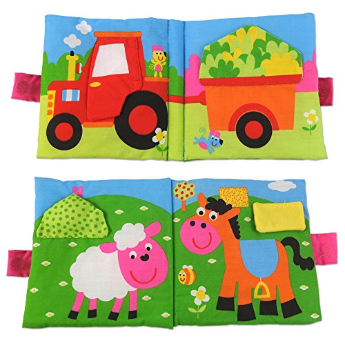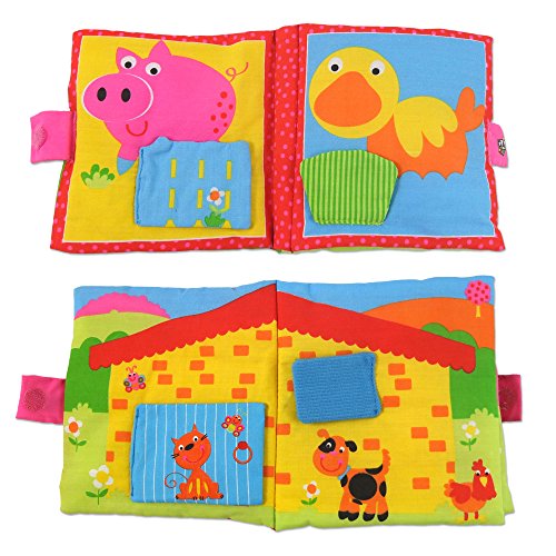 One of a range of colourful fabric books featuring 8 fun pages with textures and activities to explore, including a squeaker.The padded pages are filled with crinkle material which is so appealing to babies.Soft, safe and machine washable.Hide and Seek book has a peep-o activity on each page; Home Sweet Home book has 8 fun pages with animals in their homes; and Farm Faces book has 8 big friendly faces.Size: 14 x 14cm Birth +