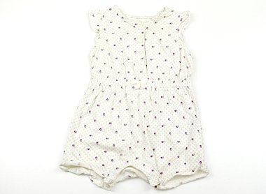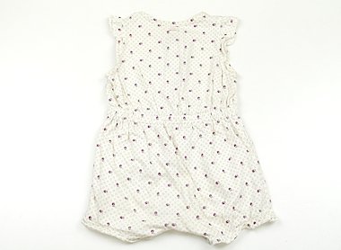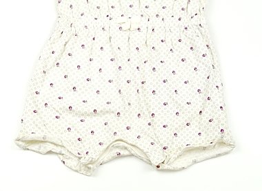 - 裾のフリル部分の縫い目が前後黄色く汚れています。前身頃脇下部分や衿ぐりに薄茶い汚れがあります。可愛いつなぎのカバーオールです。