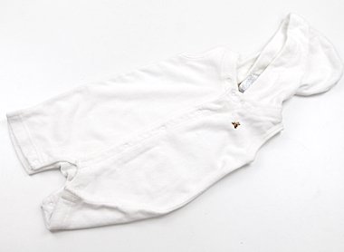 実際のサイズ表記はnew born(56-66cm)です。パイル地の商品です前身頃と後ろ身頃に薄黄色の汚れが複数ありますがまだまだ普段着として活躍してくれそうです。フードは取り外し可能です。