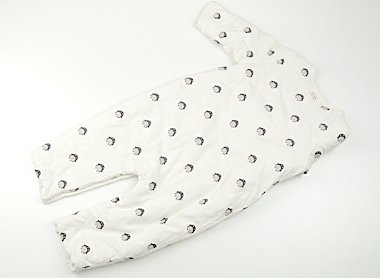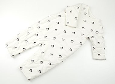 毛羽立ち感やごくうっすらとした汚れはありますが、目立つ汚れはなくまだまだお使いいただけます。中綿ではないようですが、詰め物が入っている暖かみのあるオールインワンです。
