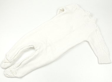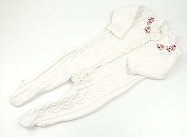 なんともラブリーなコットンケーブルニットのオールインワン!右側の腰に薄いシミがあり、編地がやや硬くなっていますが、刺繍がとっても可愛らしく、まだまだ活躍してくれそうです。