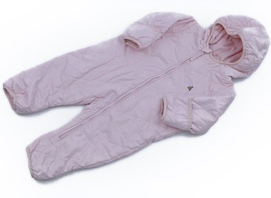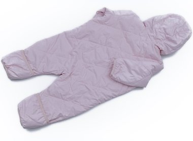 ナイロン素材にフリースの裏地がついた軽くしっかりとしたものです。手足は折り返すとしっかりと覆うことが出来ます。前襟ぐりから下のファスナーに沿って5mほど薄茶色の汚れがあります。まだまだ普段着として活躍してくれそうです。