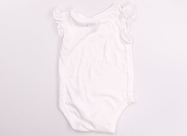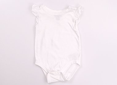 おしりと背中にグレーのシミあり。若干毛羽立ちあり。肩のレースが可愛らしいデザインです。