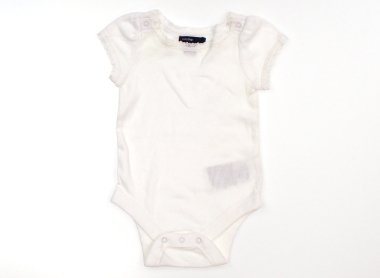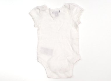 襟元と袖のレースがキュートなロンパースです。リブ素材になっています。多少の使用感ありますが、目立った汚れのない良品です。