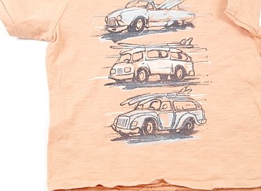 実際のサイズ表記は3yearsです。全体的にうっすら毛羽立ちがあります。前身頃中央あたりに薄く黒いシミがあります。外遊び用としていかがでしょうか?