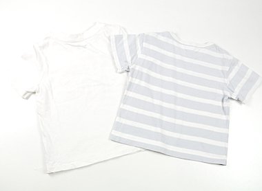 白のTシャツがGAP。毛羽立ちがあり、衿ぐり・お腹のあたりにシミがあります。MUJIのボーダーTシャツ(衿ぐり変色・毛羽立ちあり)おまけでどうぞ。お得な2枚セットです。洗い替えにいかがでしょうか?