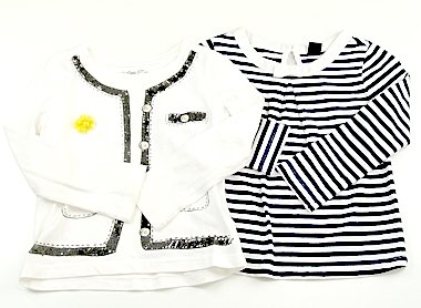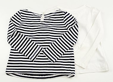 お得な2枚セットです。ボーダーは全体的に毛羽立ちがありますが目立った汚れはなくまだまだ活躍してくれそうです。オフホワイトのだまし絵プリントカットソーは前見頃に広範囲で変色があります。洗い替え用にいかがでしょう。(記名あり)