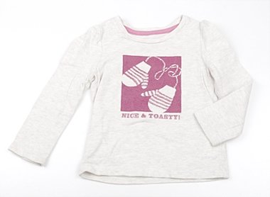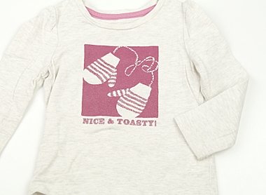 生成り系のグレーベージュです。袖口や衿元に黒ずみ・黄ばみあり。毛羽立ちもありますがプリントは状態良好です。まだまだ活躍してくれそうです。