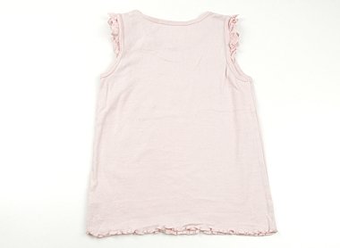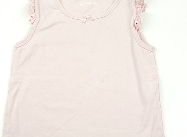 袖口に綿レースの付いたタンクトップです。胸元に小さなリボンがついており、可愛いデザインです。若干使用感がありますが、まだまだお使いいただけます。