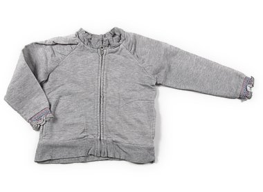 裏パイルのスウェット素材のはおり。全体的に、ややうっすらと黄変があります。スポーティな生地と衿のフリル、袖口スモッキングの女の子らしさのミスマッチがとっても可愛いお品です。まだまだお使いいただけます。(記名あり)