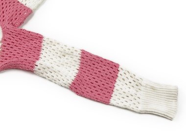 綿100%で大きく透かし編みになったニット。袖口に黒ずみ・小さなシミがあります。おしゃれなデザインです。まだまだ活躍してくれそうです。