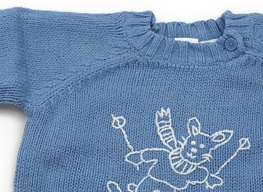 前身頃の襟ぐり下部分に薄い黄色いシミが複数あります。カットソー素材の裏地が付いており着心地がいい商品です。同ブランドの赤のセーターをお付けします(クマちゃんの部分い黄色いシミあり)