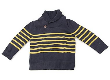 全体的な色落ちと毛羽立ちがあります。色落ちは特に右肩部分と袖に見られます。ボタンの色落ちと左袖に白い付着物があります。外遊び用としていかがでしょうか?