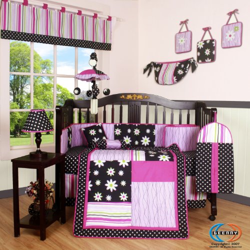 Additional matching accessories such as, Musical Mobile, Lamp Shade and Extra Window Valance available on Amazon.com;Crib, Mobile, Lamp Shade and Border are not included;Machine Washable;Material: Cotton, Polyester;13 piece set includes: one comforter, one bumper, one fitted sheet, one skirt, two window valances, one diaper stacker, one toy bag and two throw pillows, three wall art decor hangings;Charming flower theme;Sew-on pattern, not print pattern;Additional matching accessories such as, musical mobile, lamp shade and extra window valance available;Mobile, lamp shade and border are not included