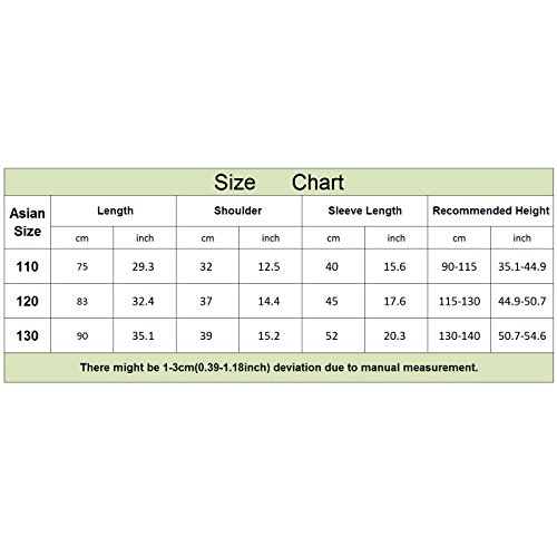 110:着丈:75cm 肩幅:32cm 袖丈:40cm 参考身長:約90-115cmの子供 120:着丈:83cm 肩幅:37cm 袖丈:45cm 参考身長:約115-130cmの子供 130:着丈:90cm 肩幅:39cm 袖丈:52cm 参考身長:約130-140cmの子供