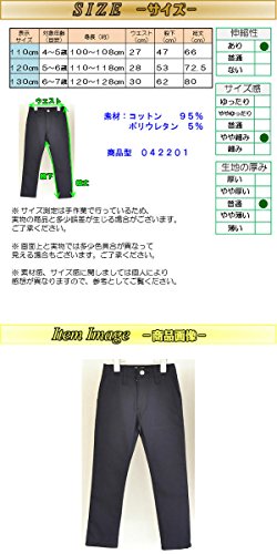 表示サイズ(110) 年齢(5歳) 身長(約100~110cm) ウエスト(27cm) 股下(47cm) 総丈(66cm) / 表示サイズ(120) 年齢(5~6才) 身長(約110~120cm) ウエスト(28cm) 股下(53cm) 総丈(72.5cm) / 表示サイズ(130) 年齢(6~7才) 身長(約120~130cm) ウエスト(30cm) 股下(62cm) 総丈(80cm) 素材: コットン95%, ポリウレタン5%