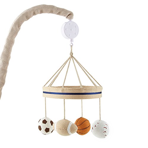 WARNING: Possible entanglement or strangulation injury; Remove mobile when baby begins to push up on hands and knees;Give your little slugger a championship nursery he'll love with Levtex Baby's Little Sport Musical Mobile;Features knitted cotton football, baseball, basketball, and soccer ball;Plays a series of lullabies; Digital on/off button;Measures 15 W x 28 H; Imported