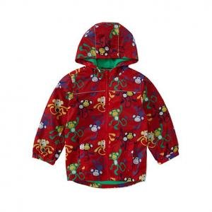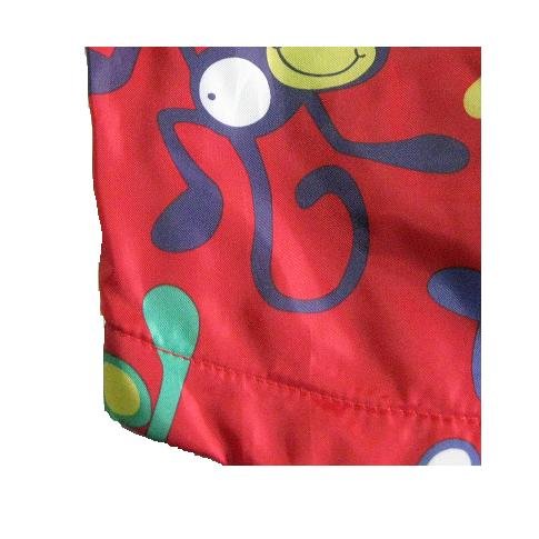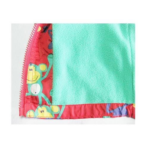 この防水加工されたウィンドブレーカーのようなジャンパーは、内側がフリース加工されていて、体温をキープしてくれる。外側が防水加工されているので、突然の雨・雪にもぬれない。とても便利な一品。赤の地におサルの柄。超かわいい一品