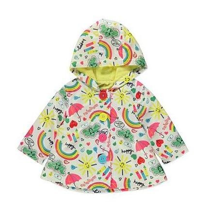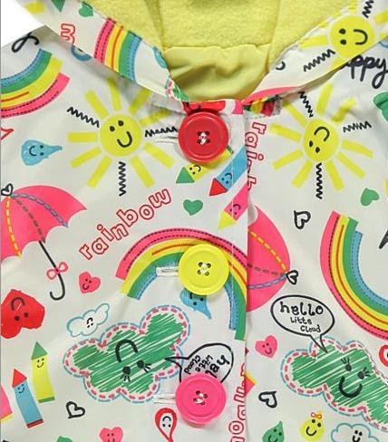この防水加工されたウィンドブレーカーのようなジャンパーは、内側がフリース加工されていて、体温をキープしてくれる。外側が防水加工されている厚手のナイロンジャンパーなので、突然の雨・雪にもぬれなく、子供の体温をキープ。とても便利な一品。虹や傘、ハートがかわいらしさを引き立てる!